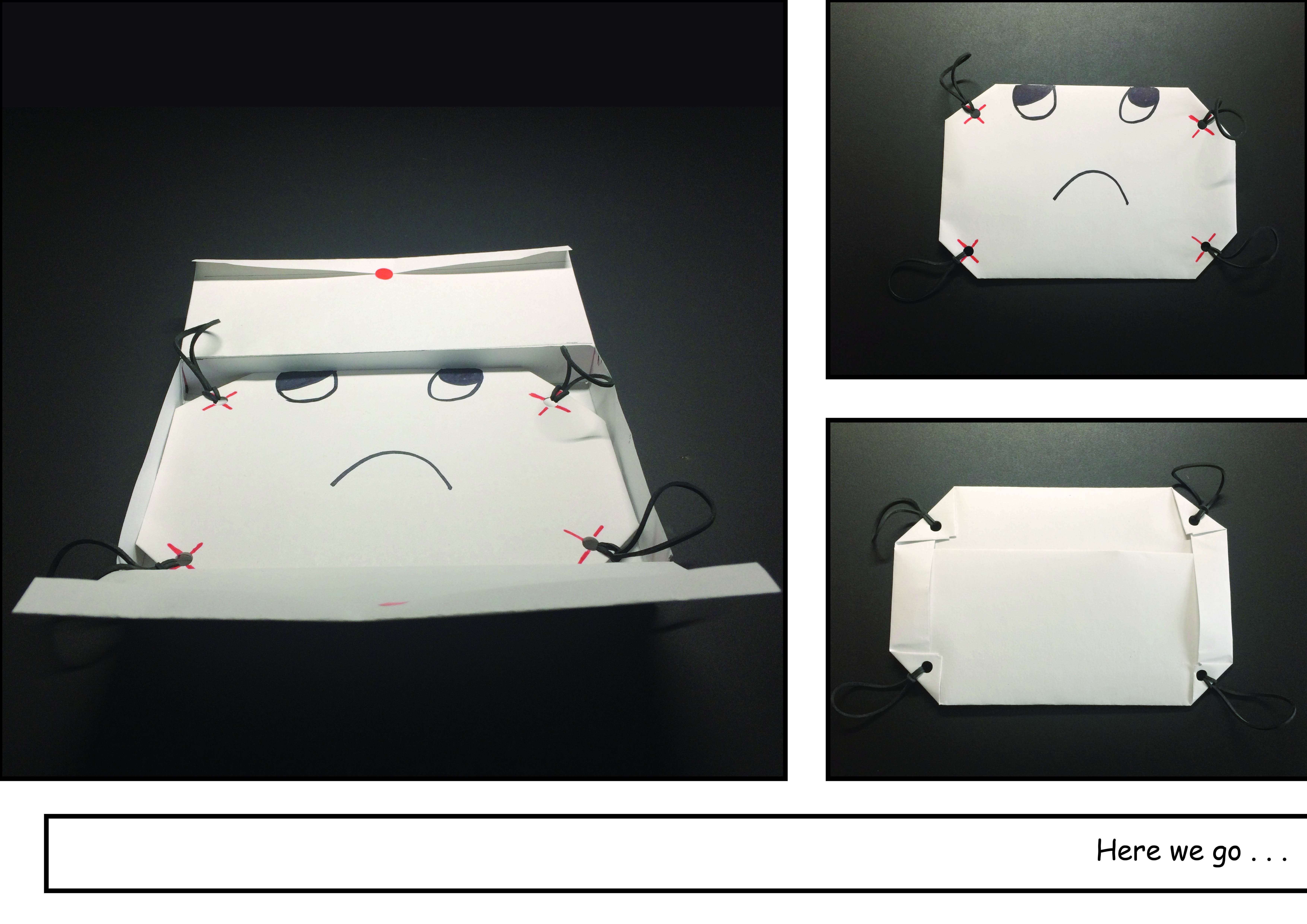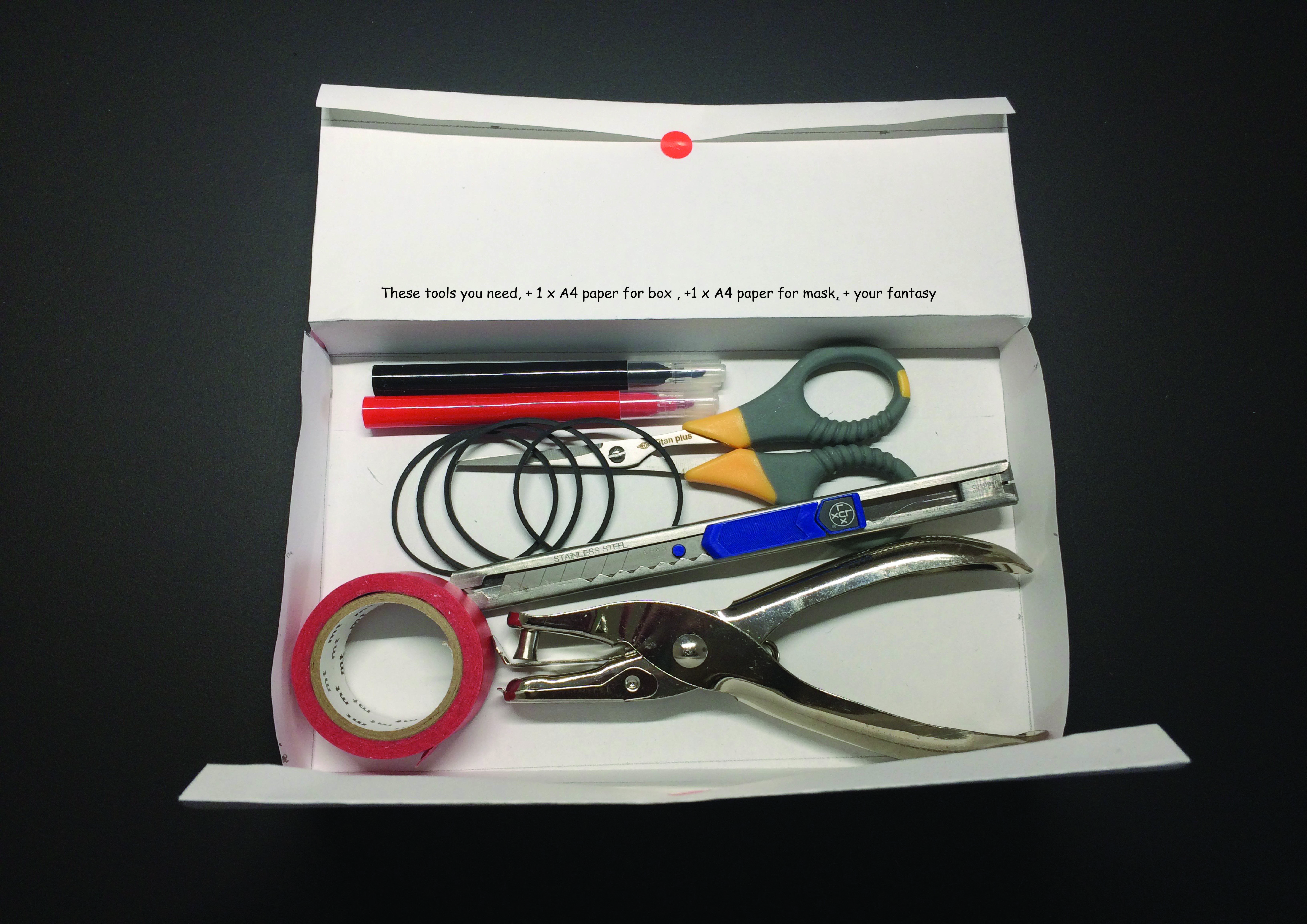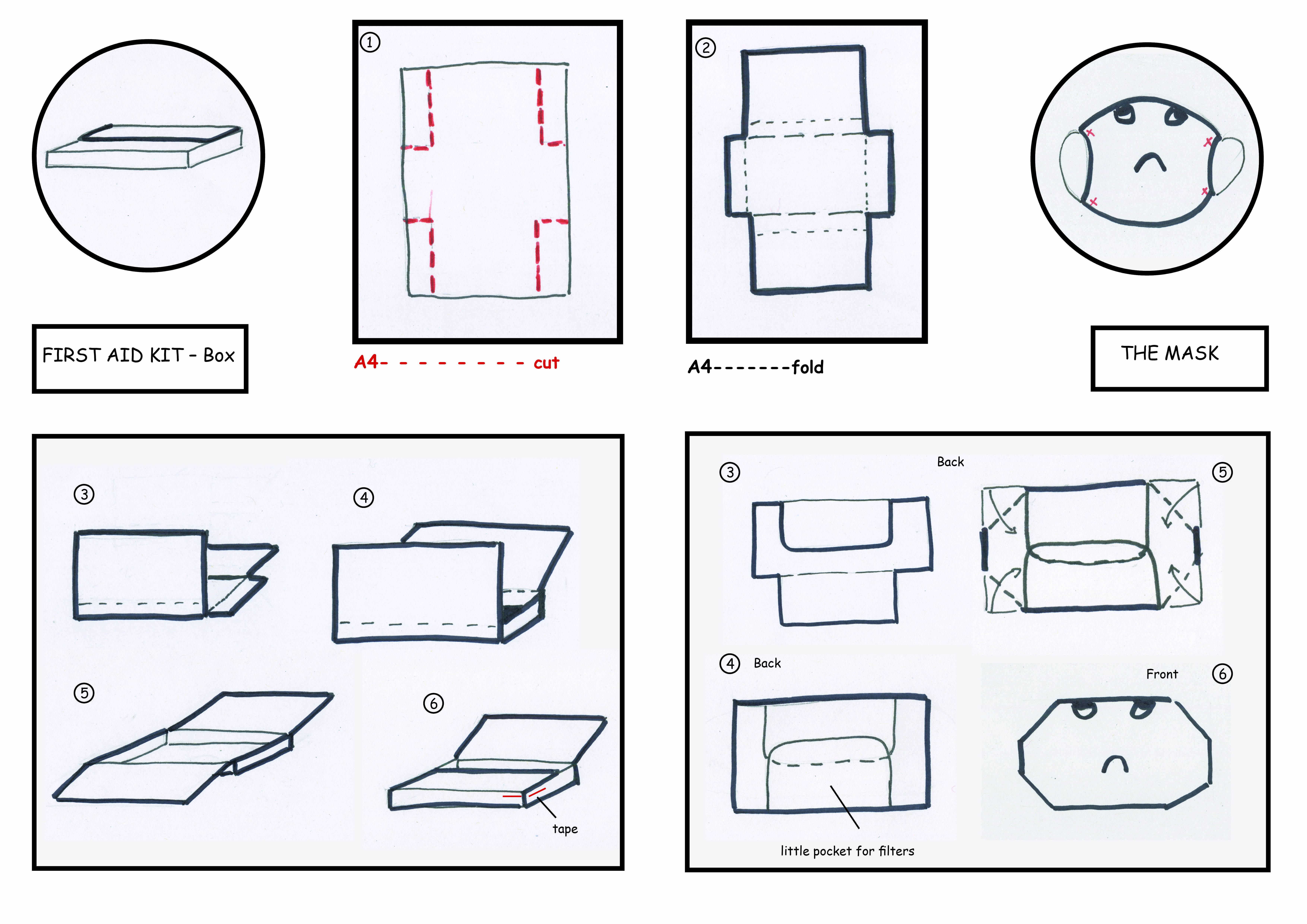 In this example, kids can create their own first aid box and a mask made of one A4 sheet of paper. But of course, you can replace the paper with fabric and quickly produce a wearable mouth and nose mask.
