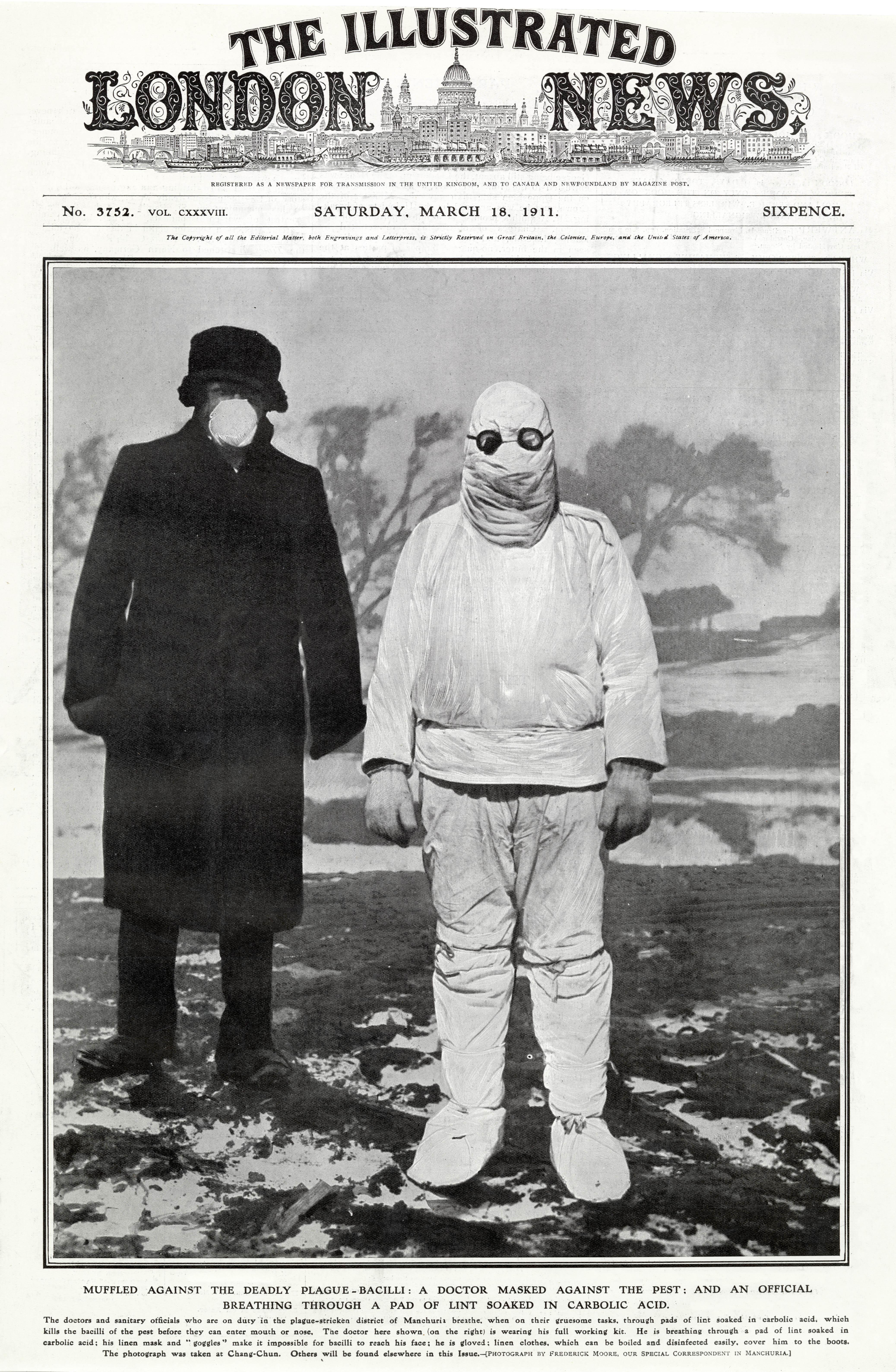 Figure 3. The Manchurian Plague in the British news. (“Muffled Against the Deadly Plague-Bacilli,” The Illustrated London News, March 18, 1911, page 1.)